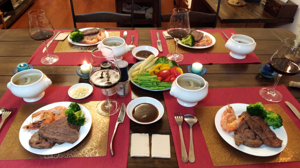 耶誕節~~媽媽料理晚餐,孩子布置桌面,先生準備紅酒,邀請外公一起在家裡共享耶誕節-牛排大餐